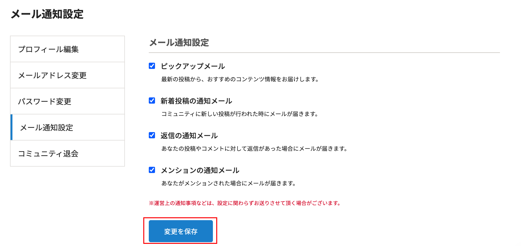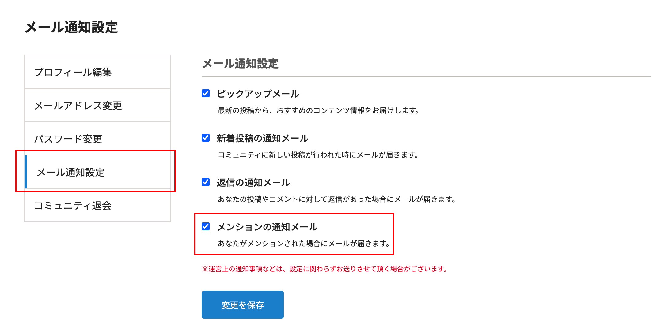 「メンションの通知メール」にチェックを入れて、「変更を保存」をクリックしてください。